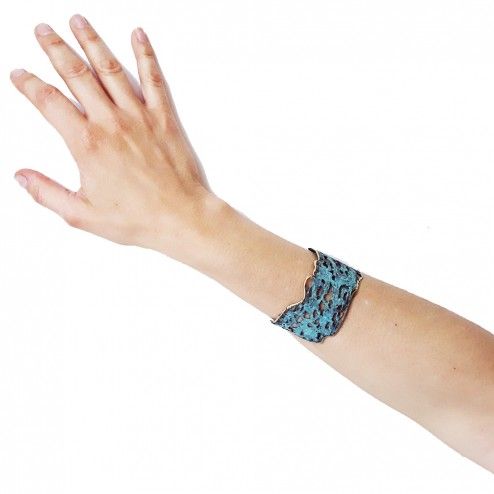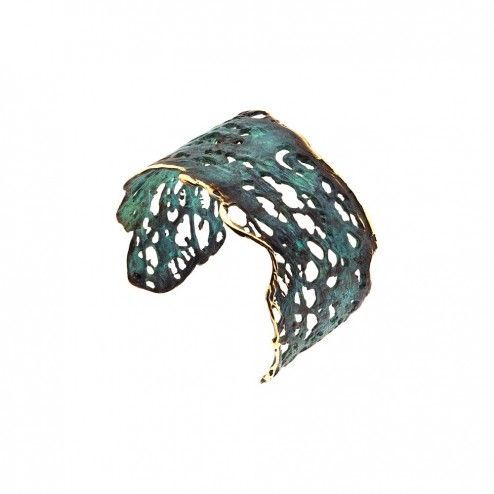 Esta pulsera está realizada en bronce y tiene una patina verde que realza el contraste del tono dorado del bronce. La pieza es como una mini escultura inspirada en la naturaleza. Su verde tiene una tonalidad que recuerda a los elementos orgánicos. Es un color que recuerda a la vegetación de los fondos marinos, las algas del fondo del mar, o el musgo de las rocas.