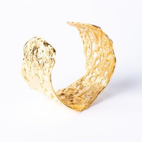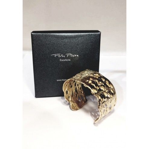 Esta pulsera está realizada en bronce y tiene una patina verde que realza el contraste del tono dorado del bronce. La pieza es como una mini escultura inspirada en la naturaleza. Su verde tiene una tonalidad que recuerda a los elementos orgánicos. Es un color que recuerda a la vegetación de los fondos marinos, las algas del fondo del mar, o el musgo de las rocas.